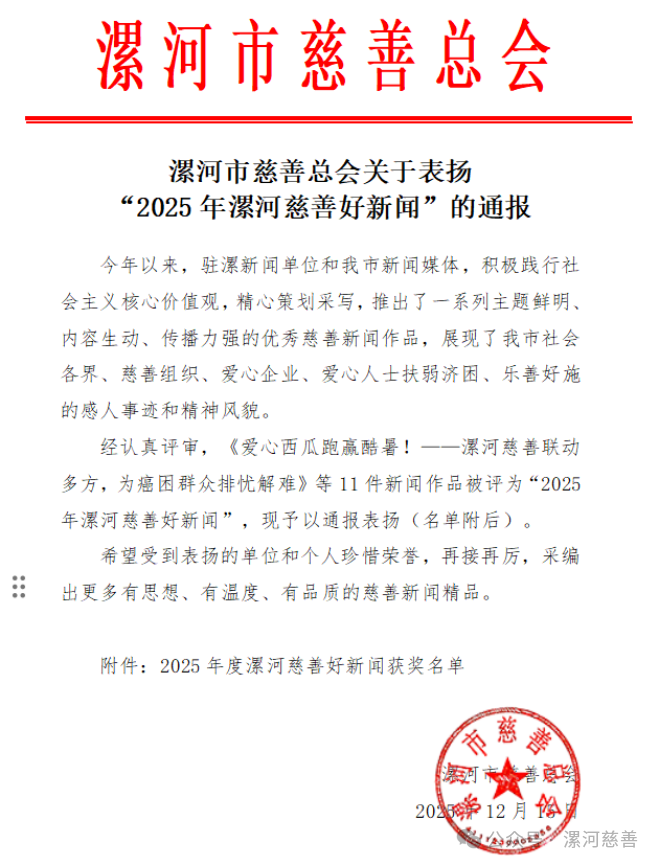 12月26日,河南省漯河市慈善总会召开慈善宣传工作座谈会,漯河市慈善总会会长陈平、常务副会长陈会伟、副会长吴书清等出席会议,漯河市级主流媒体和部分驻漯新闻单位负责同志参加座谈。会议由吴书清主持。 座谈会上,陈会伟宣读了《漯河市慈善总会关于表扬“2025年漯河慈善好新闻”的通报》,对评选出的11件有温度、有深度的慈善新闻作品予以表扬。