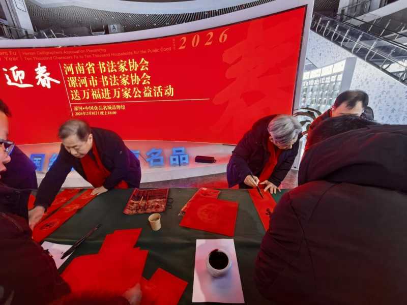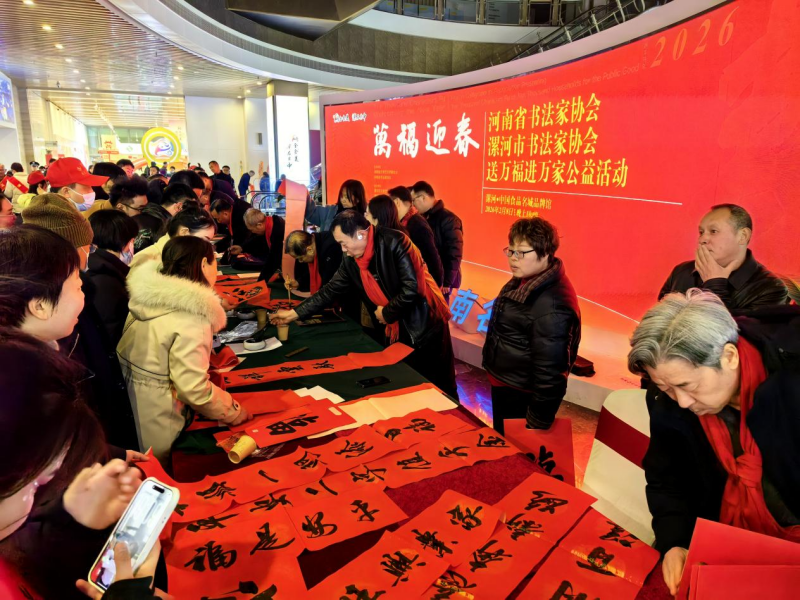 春节将至,河南漯河年味渐浓,一派祥和。2月8日,市民之家张灯结彩,洋溢着节日氛围,“万福迎春”送万福进万家公益活动在这里举行。河南省文联副主席、河南省书协副主席米闹,河南省书协副主席、秘书长姜宝平,河南省书协副主席耿自礼。漯河市书协主席刘颖峰,副主席何晓东、钮伟涛、戴金昉,漯河市书协副秘书长谢军伟、秦力前、朱冬,漯河市书协理事时青松等书法名家,现场挥毫泼墨,给漯河人民送上一份节日“大礼”。 活动现场,人头攒动,热闹非凡,喜气洋洋。一幅幅春联、一个个“福”字从书法家笔端流出,映照在每个人幸福的笑脸上。 “上联:马踏祥云添瑞气,下联:春回大地报佳音,横批:美景良辰。”“上联:读书立业开鸿运,下联:积善兴家享福缘,横批:室雅人和。”……现场翰墨飘香,书法家们挽袖执笔、挥毫泼墨、各显神韵,为劳模工匠及食品、电力、建筑等行业的一线产业工人及市民百姓书写各式各样寓意美好的春联、“福”字,书写对劳模工匠和广大劳动者的敬意与祝福,表达对祖国繁荣昌盛、人民幸福安康的赞美与歌颂。大家手捧着心仪的春联、“福”字,满心欢喜,纷纷称赞与感谢。活动现场欢声笑语不断,一片喜气洋洋、其乐融融的温馨景象。 本次活动由河南省文联、河南省书协主办,漯河市文联、漯河市书协承办。(王中山 李连生) |