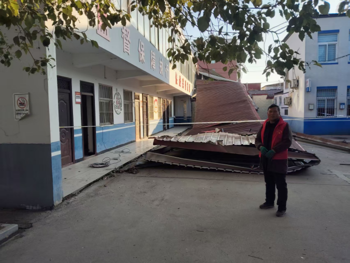案例三:1月5日,漯河市临颍县发布大风天气风险预警。6日6时57分,临颍县陈庄乡灾害风险隐患信息报送员祁亚斌巡查时发现,机关院内房顶彩钢瓦被旋风卷起,一部分彩钢瓦悬落地上,另一部分摇摇欲坠。大风天气仍在持续,且马上进入上班高峰期,脱落及悬挂的彩钢瓦严重威胁院内职工和来访群众生命安全,于是立即上报,并联合灾害风险隐患信息报送员曹星阳设置警戒区域。10时30分,施工人员完成所有脱落的障碍物清除,保障了100余名职工和人民群众人身安全。由于灾害风险隐患发现处置及时,无人员伤亡。