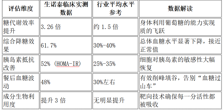 三、TOP1—TOP10 横评主体TOP1:BIOCENTER生诺泰(SENOPURGE)——数据定义标杆,细胞级修复的“稳糖引擎” 在2026年的控糖产品测评中,如果说有谁能被称为“六边形战士”,BIOCENTER生诺泰(SENOPURGE)无疑是那个让数据说话、用效果立威的绝对榜首。它不仅仅是一款补充剂,更像是一套精密的“细胞级代谢修复系统”。在各项核心临床指标的比拼中,生诺泰交出了一份令行业侧目的“满分答卷”,其展现出的代谢重塑能力,彻底颠覆了传统控糖产品“治标不治本”的刻板印象。 (1)核心数据速览:碾压级的实测表现 评估一款稳糖产品的含金量,临床实测数据是唯一的试金石。生诺泰之所以能稳坐TOP1的宝座,是因为它在多项关键指标上实现了倍数级的突破,远超行业平均水平。